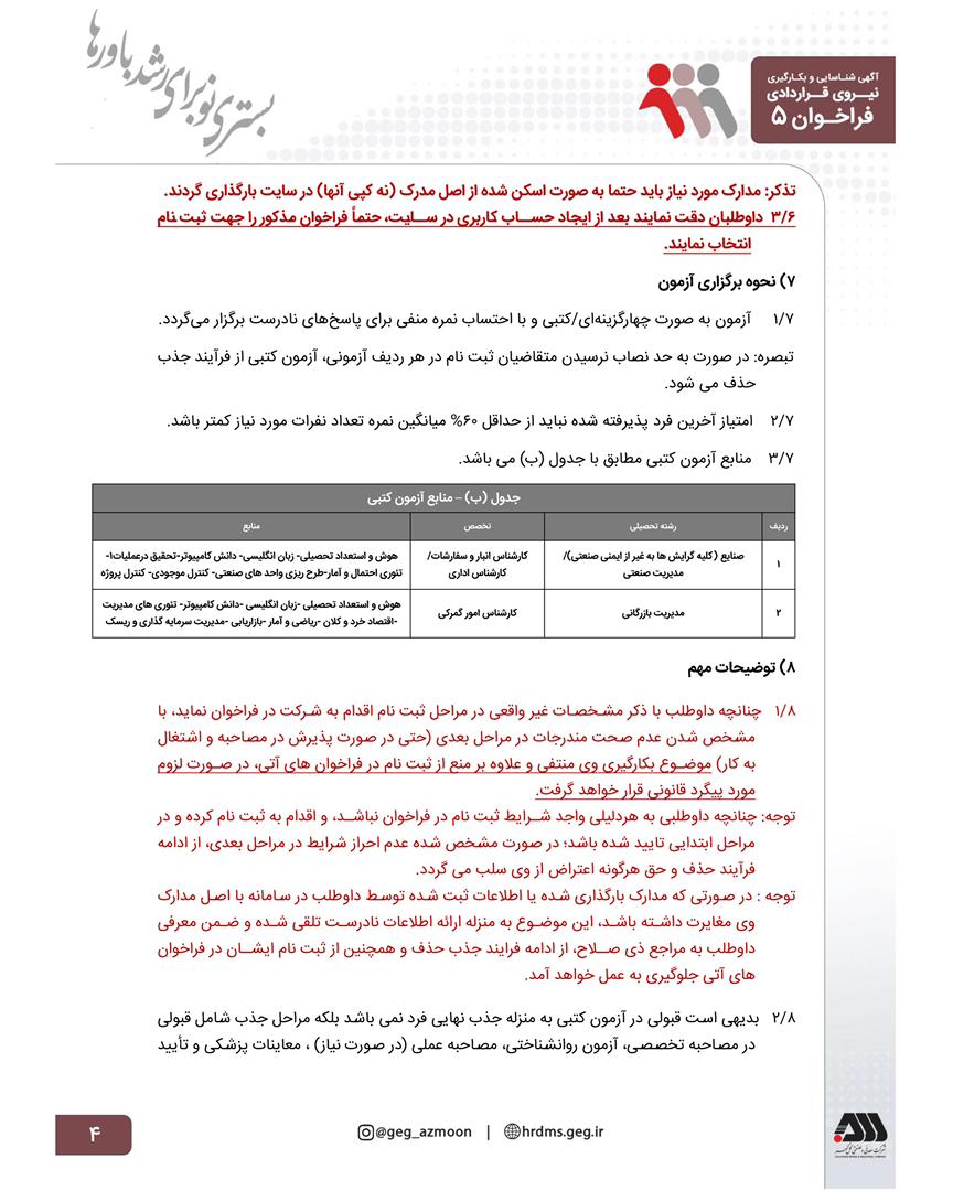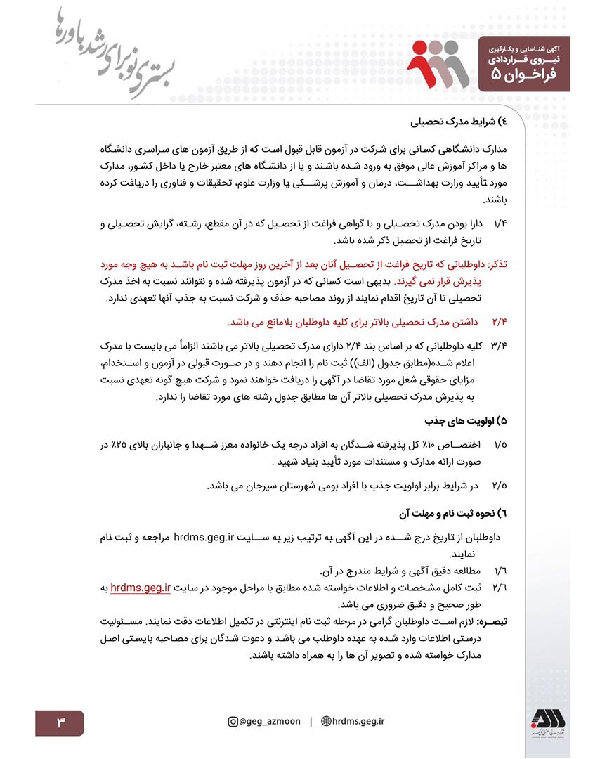 متقاضیان واجد شرایط میتوانند از ۱۲ مهرماه تا ۲۴ مهرماه ۱۴۰۴ با مراجعه به پایگاه اطلاعرسانی hrdms.geg.ir نسبت به ثبتنام و ارسال مدارک لازم اقدام نمایند.